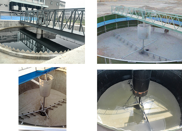 中心傳動刮吸泥機採用中心傳動,污水從進水管流入導流筒擴散後,均勻的向周邊呈輻射狀流出,呈懸浮狀的污泥經沉澱後沉積於池底,驅動裝置帶動中心豎架旋轉,並帶動刮臂及刮泥闆轉動,刮泥闆将污泥刮集後由吸泥管靠池内靜水壓抽吸至中心泥缸,再通過中心排泥管排出池外,水面上的浮渣通過旋轉撇渣裝置導入排渣鬥内排出池外;而上清液則通過三角形出水堰闆溢入出水槽内排出。我公司将會針對用戶不同工藝控制條件要求,做相應的配套調整設計,以確保泥漿沉降分離和洗滌效果,減少浪費,節約投資成本。